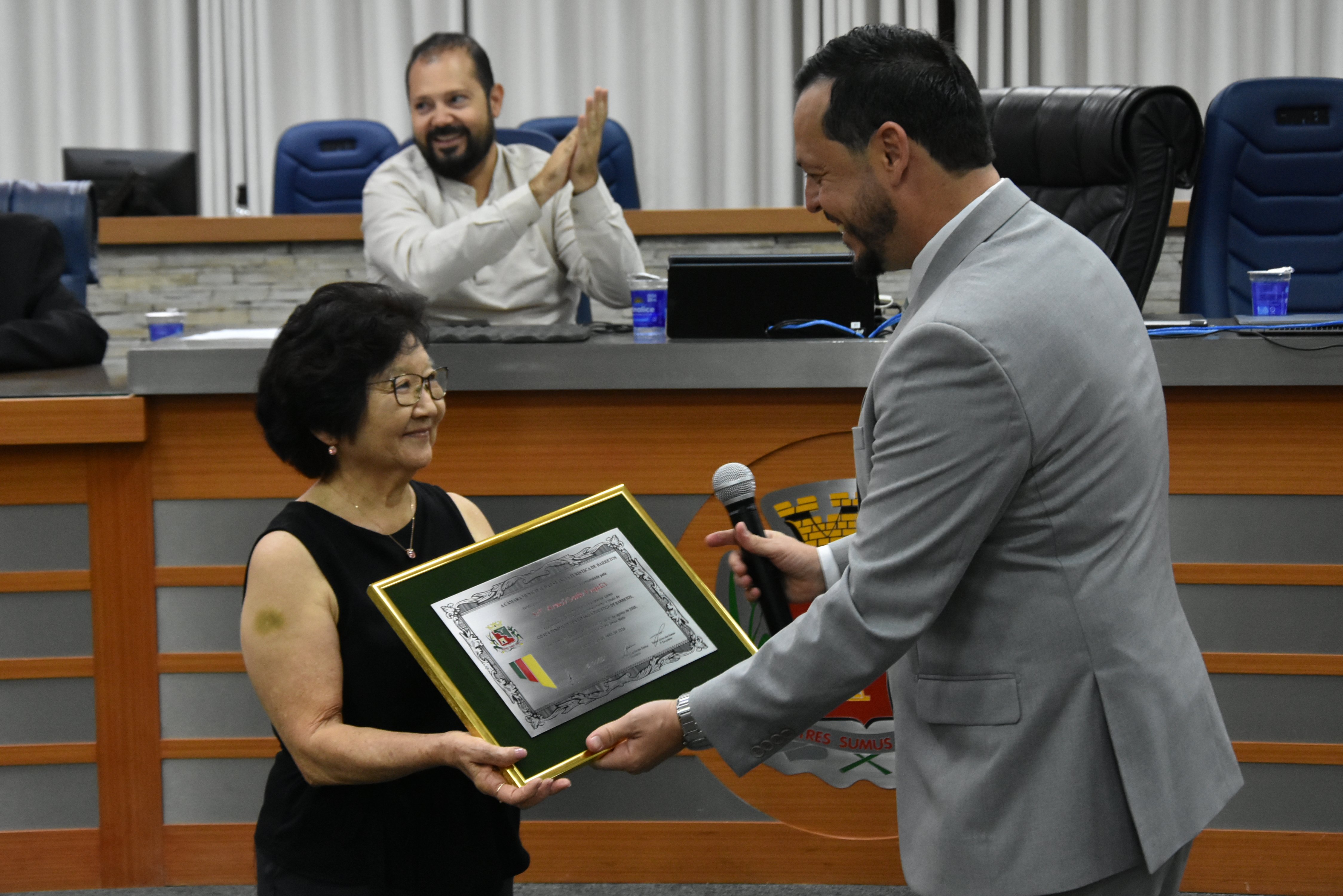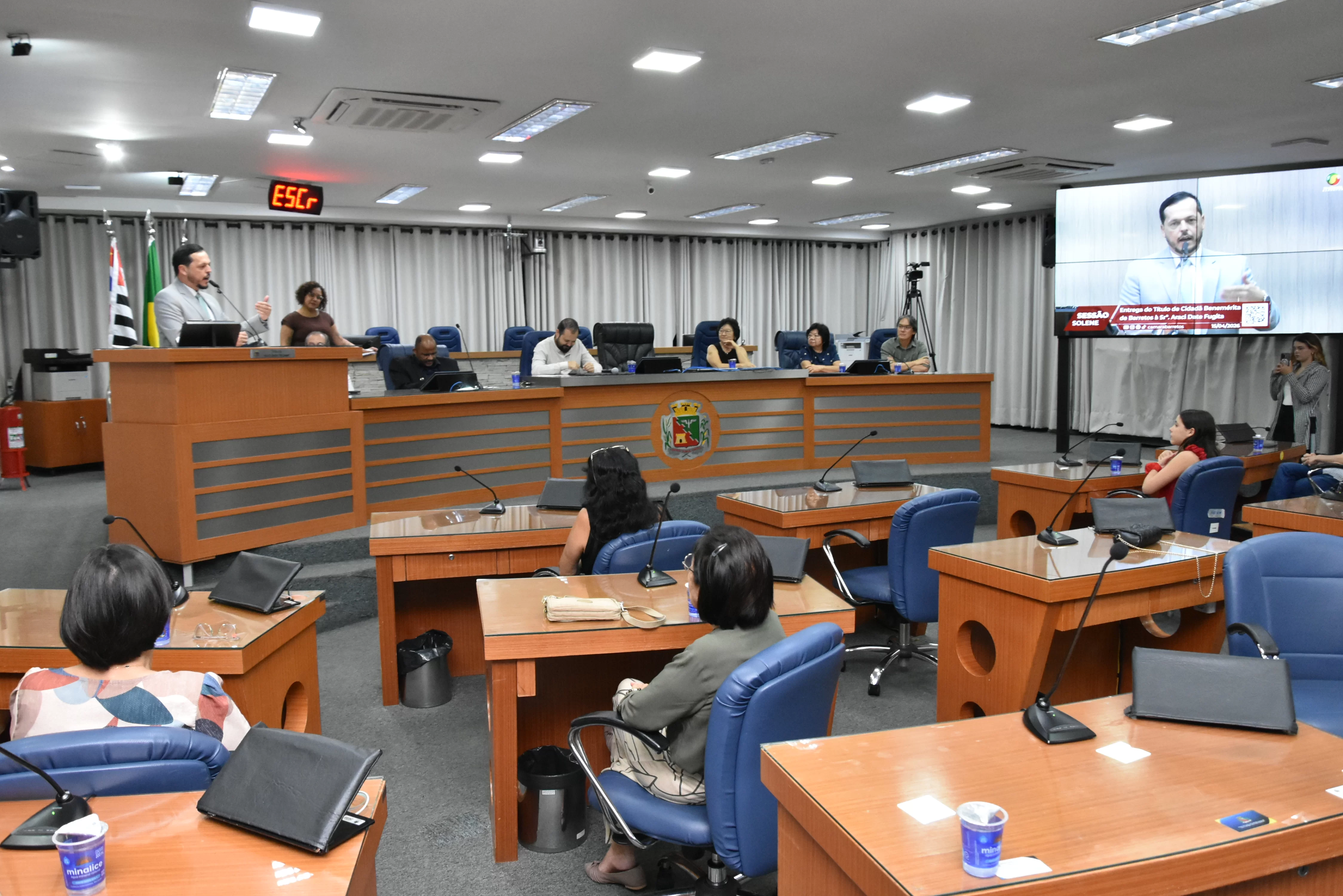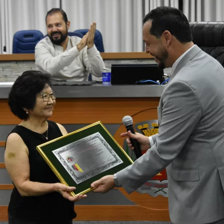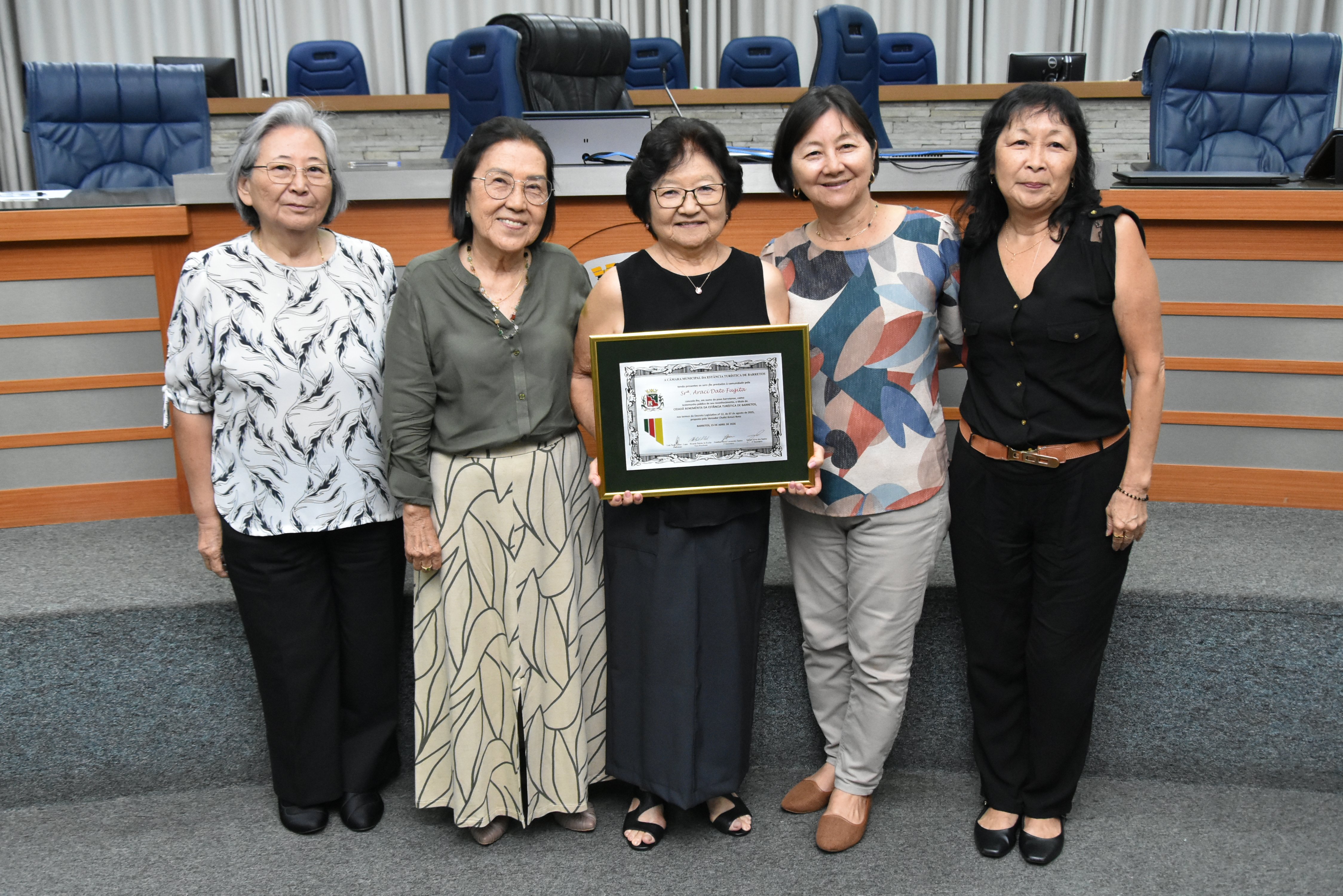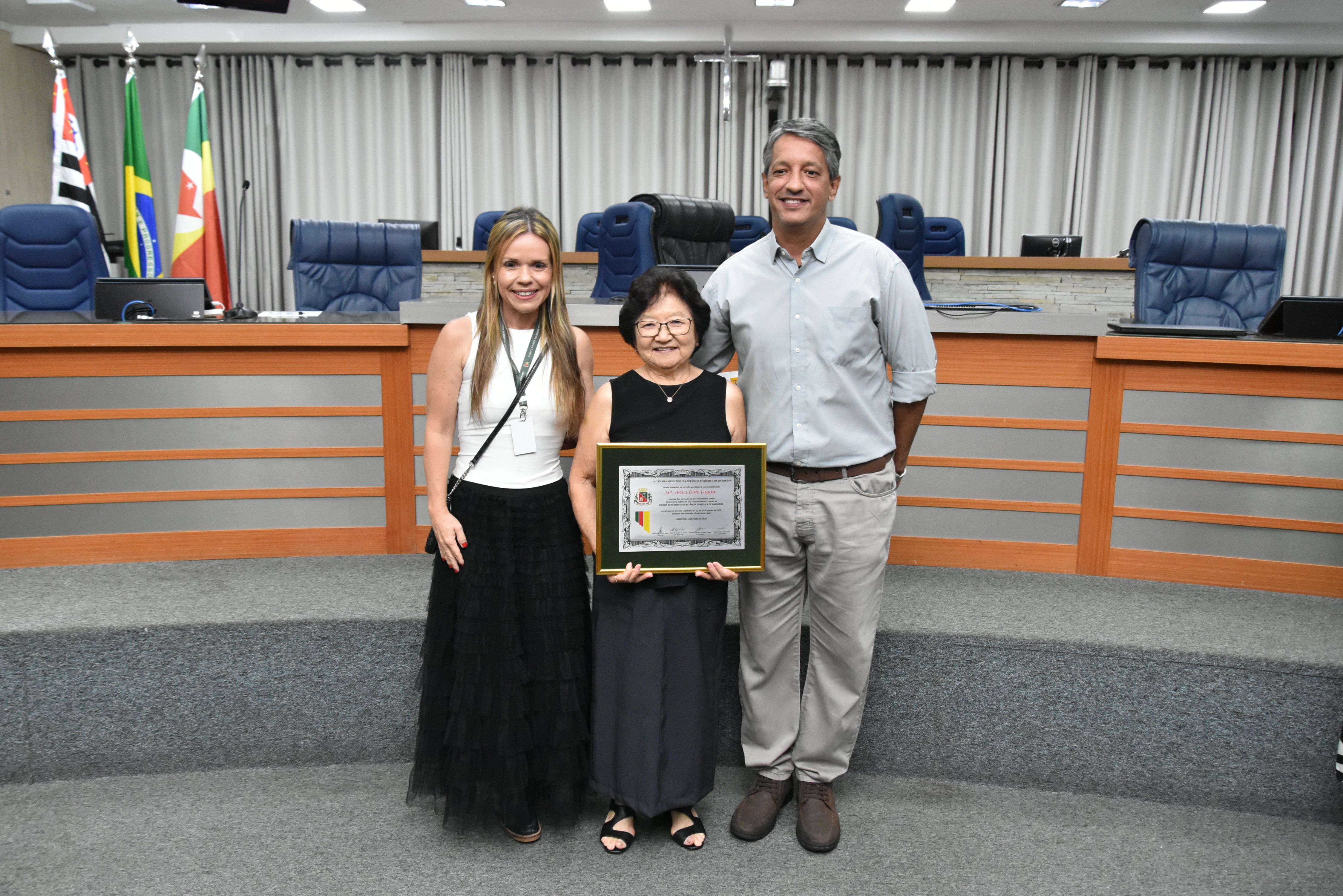 Na noite desta quarta-feira, 15, a Câmara Municipal fez a entrega do Título de Cidadã Benemérita de Barretos à Srª Araci Date Fugita. A homenagem foi concedida durante sessão solene transmitida ao vivo pela TV Câmara.