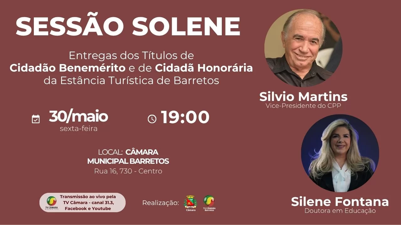 A Câmara de Barretos agendou para o dia 30 de maio (sexta-feira), às 19h, Sessão Solene para as entregas do Título de Cidadão Benemérito da Estância Turística de Barretos ao atual vice-Presidente do CPP - Centro do Professorado Paulista, Silvio dos Santos Martins; e do Título de Cidadã Honorária da Estância Turística de Barretos à Doutura em Educação, Silene Fontana.