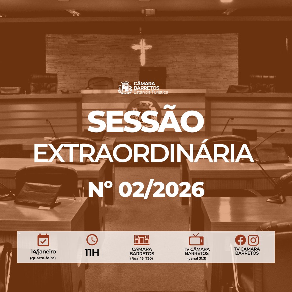 Em cumprimento à Lei Orgânica e ao Regimento Interno, fica convocada a 2ª Sessão Extraordinária para esta quarta-feira, 14 de janeiro de 2026, às 11h. O encontro será dedicado unicamente à votação das matérias que constam na Ordem do Dia, não sendo permitido debater outros temas nesta ocasião.
