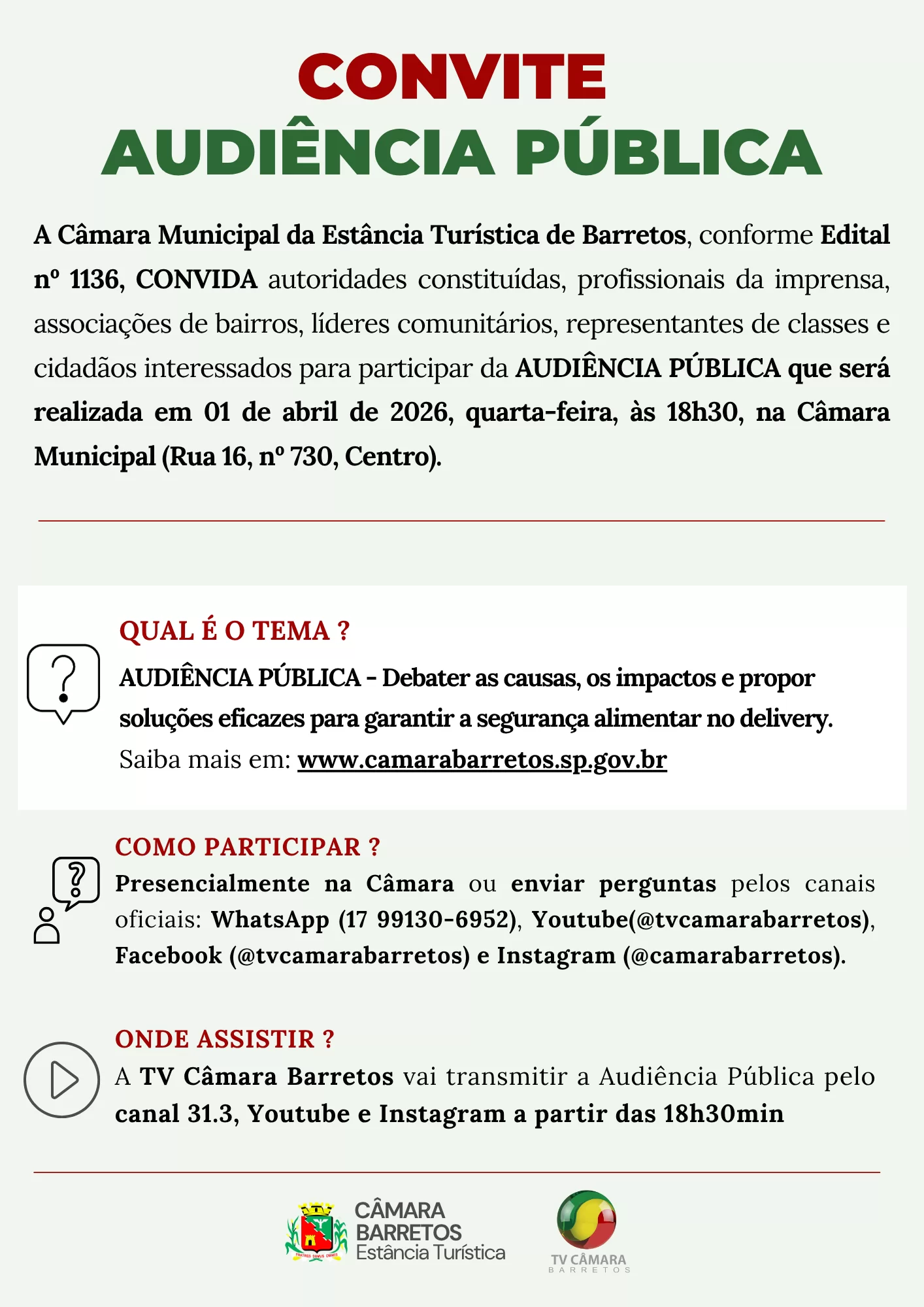 Acontecerá no próximo dia 1º de abril, quarta-feira, às 18H30, no Plenário da Câmara, Audiência Pública para discutir a segurança alimentar no delivery em Barretos.