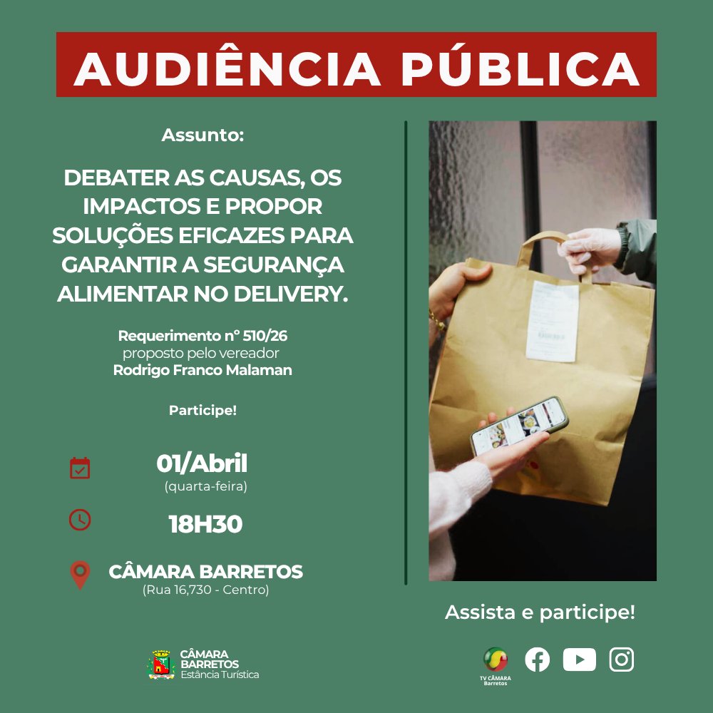 Acontecerá no próximo dia 1º de abril, quarta-feira, às 18H30, no Plenário da Câmara, Audiência Pública para discutir a segurança alimentar no delivery em Barretos.