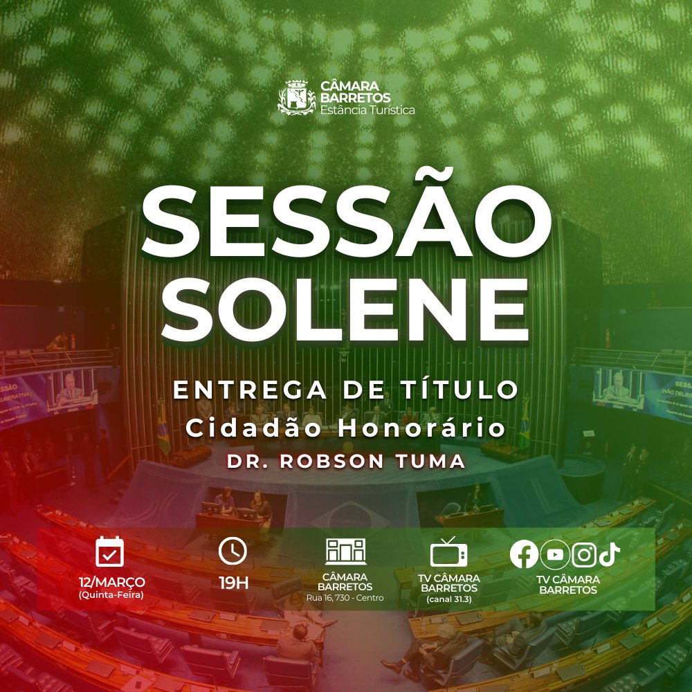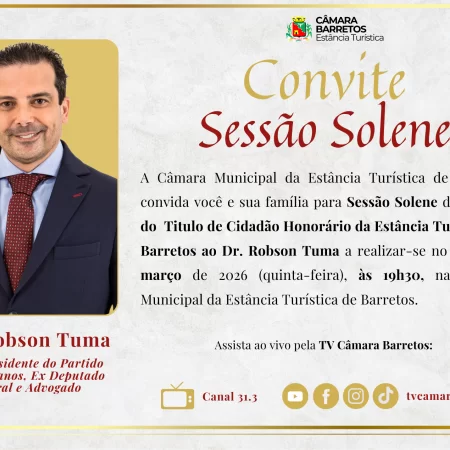 A Câmara Municipal de Barretos realizará no dia 12 de março (quinta-feira), às 19h, Sessão Solene para entrega do Título de Cidadão Honorário da Estância Turística de Barretos ao Dr. Robson Tuma, Presidente do Partido Republicanos da capital de São Paulo.