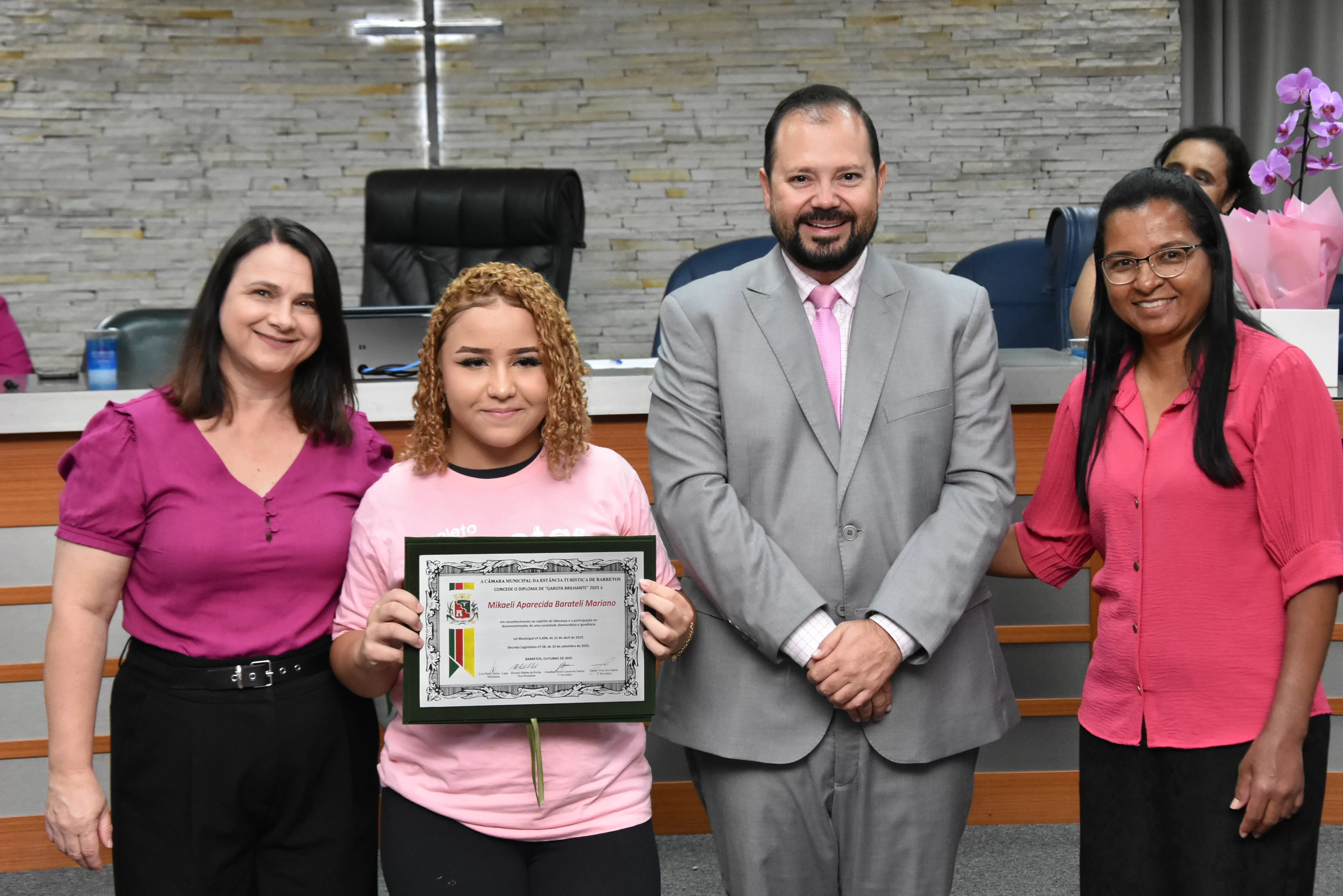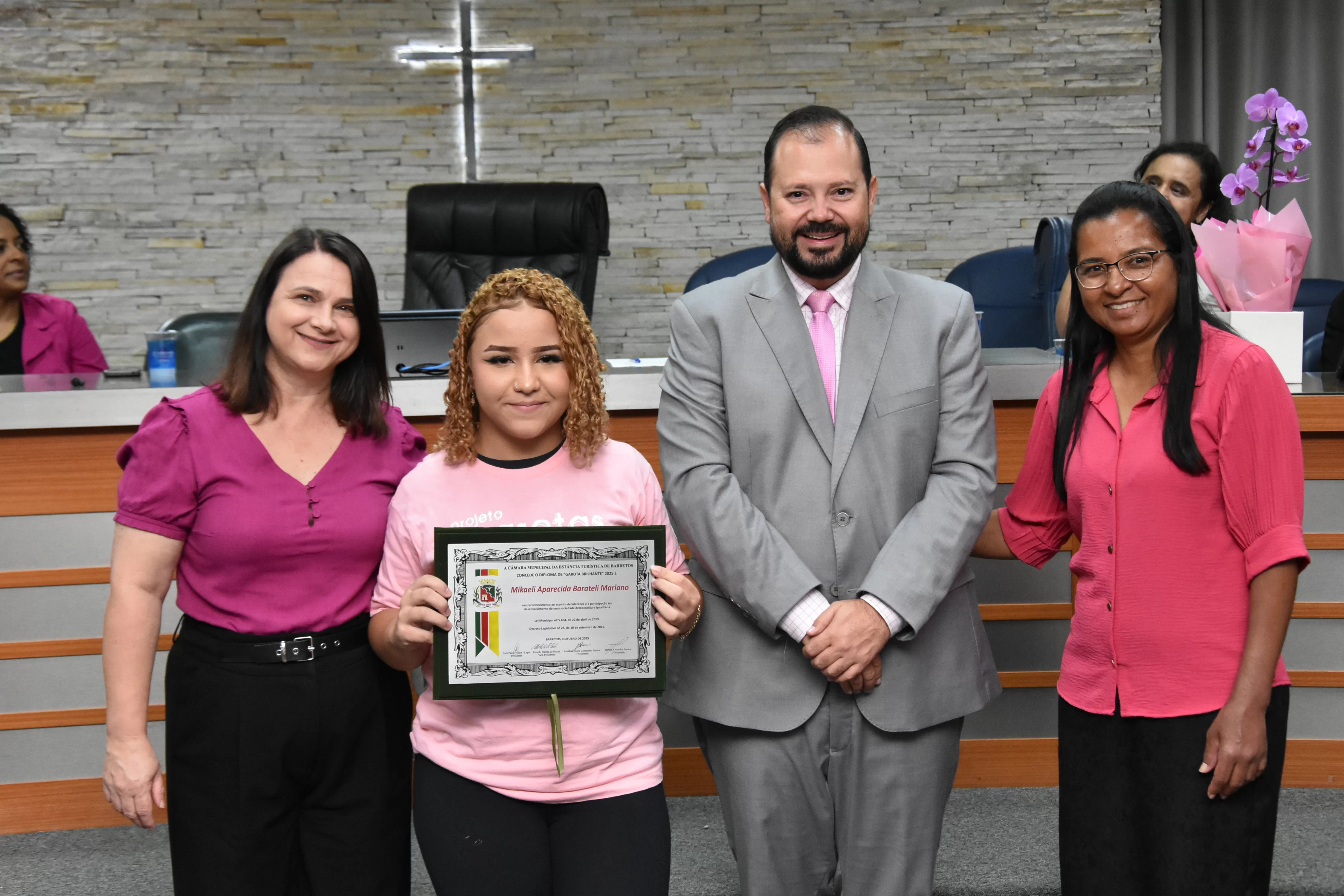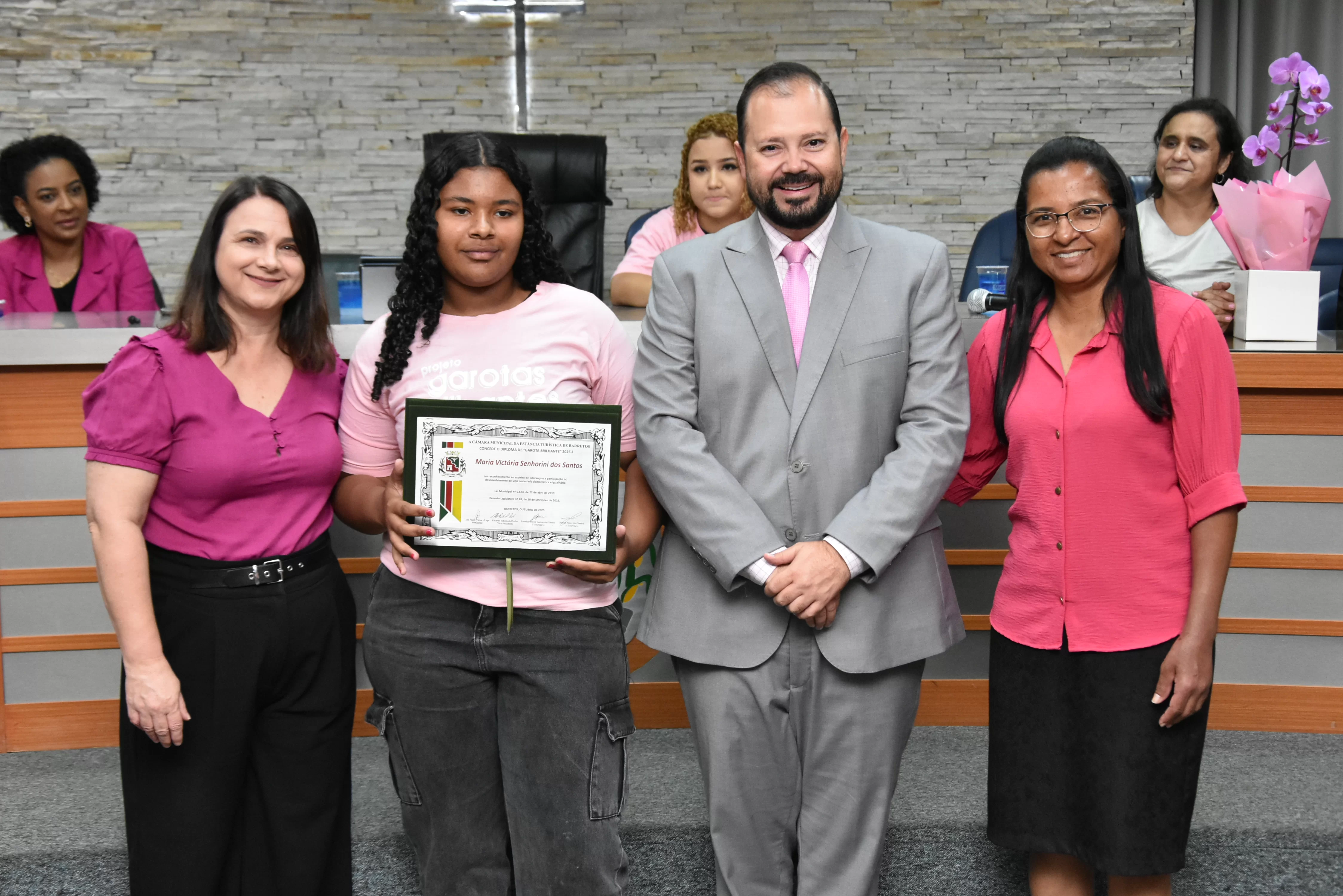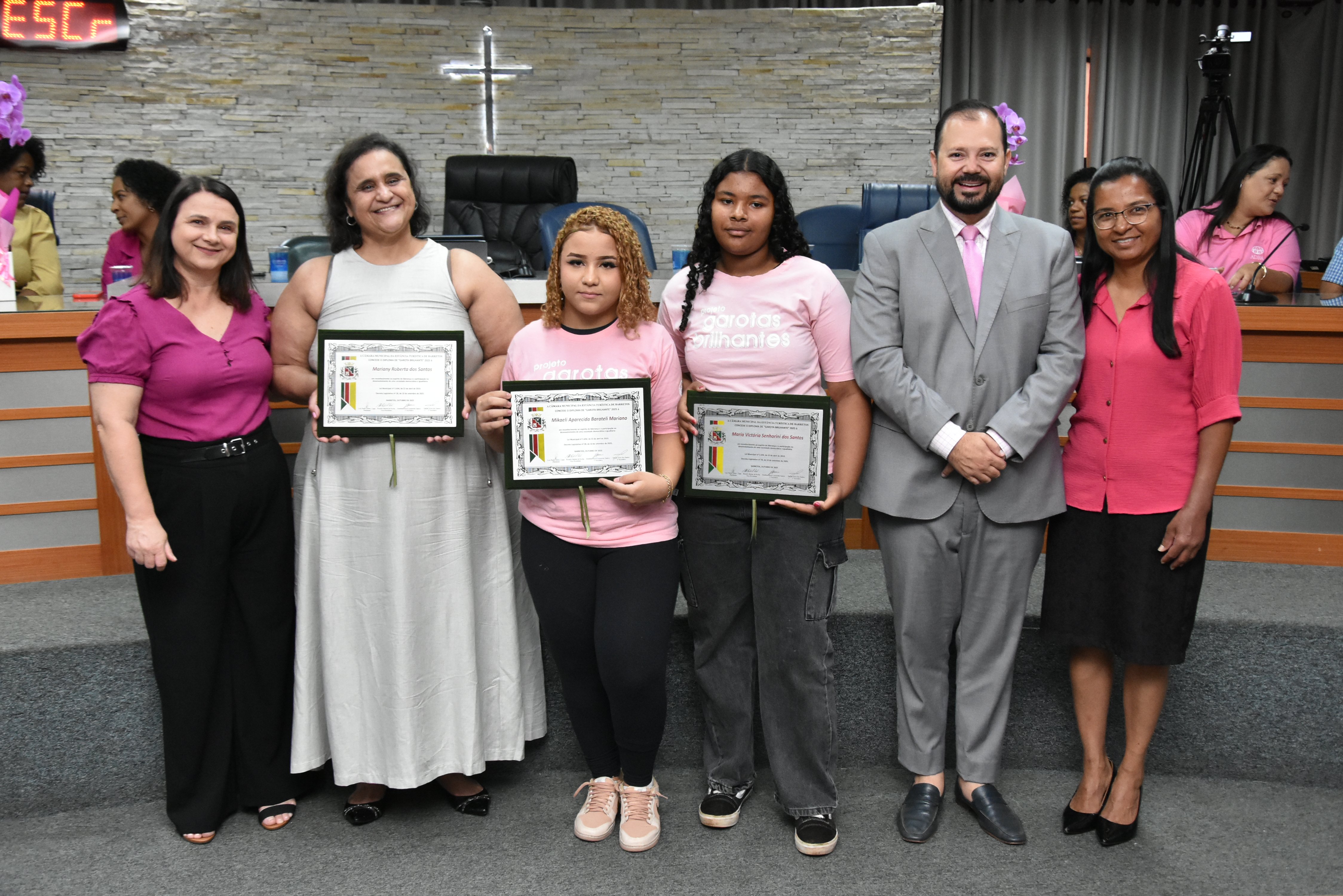 A solenidade foi conduzida pelo 2º Secretario da Câmara, Vereador Itamar Alves dos Santos (PSD) e contou ainda com presença do vereador Marcos Mariano (UNIÃO); da Coordenadora do CAAF -Centro Adventista de Apoio à Família de Barretos, Adriana Gonçalves Ferreira; da Assistente Social do Projeto Garotas Brilhantes, Pâmela Camargo; da Coordenadora Regional da ADRA - Agência Adventista de Desenvolvimento e Recursos Assistenciais, Estela Maris Miller Reis; da Diretora da Escola Estadual Mario Vieira Marcondes (local onde funciona o projeto Garotas Brilhantes); Marta Regina Rocha, Secretária Municipal de Assistência Social e Desenvolvimento Humano, Juliana Adão.