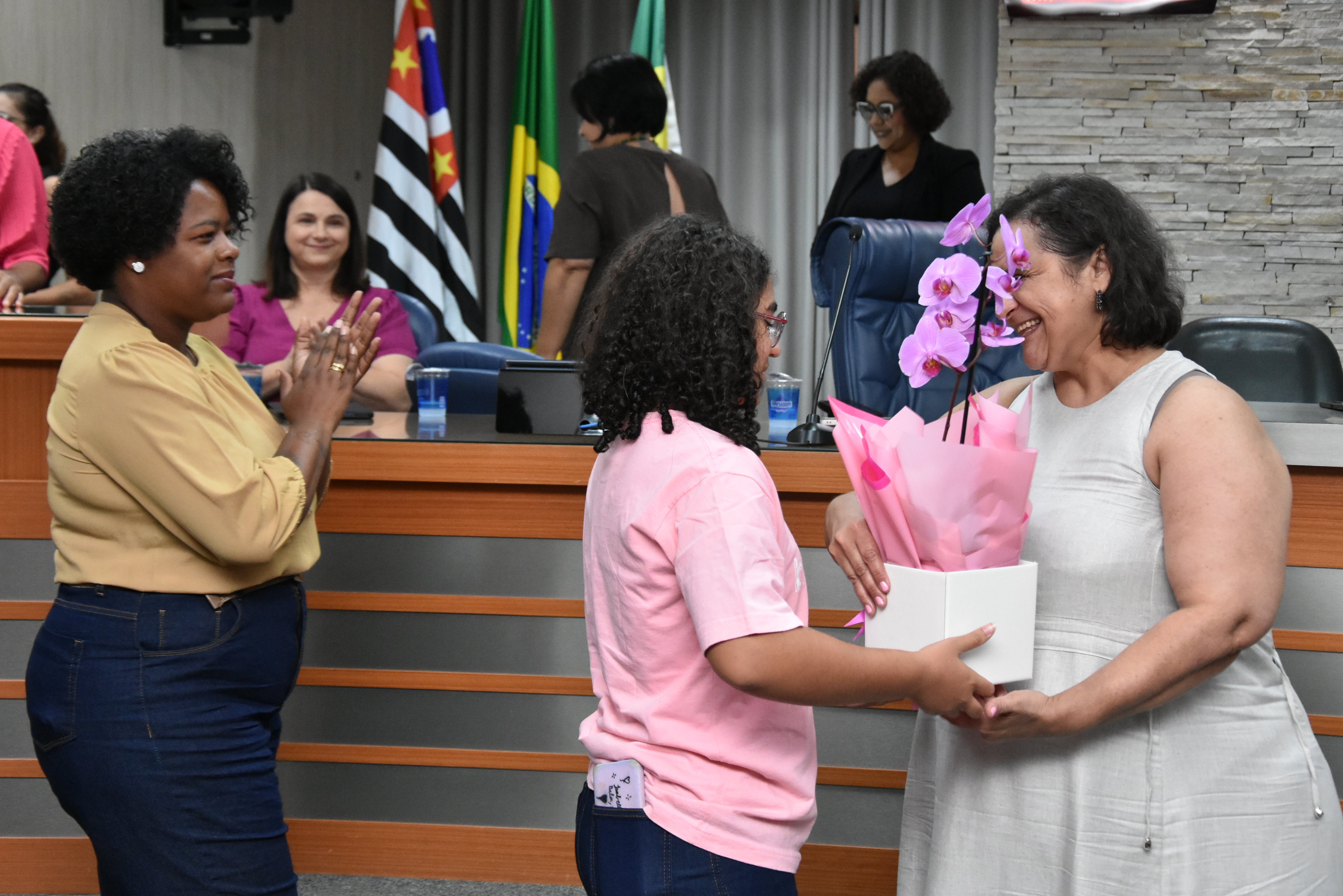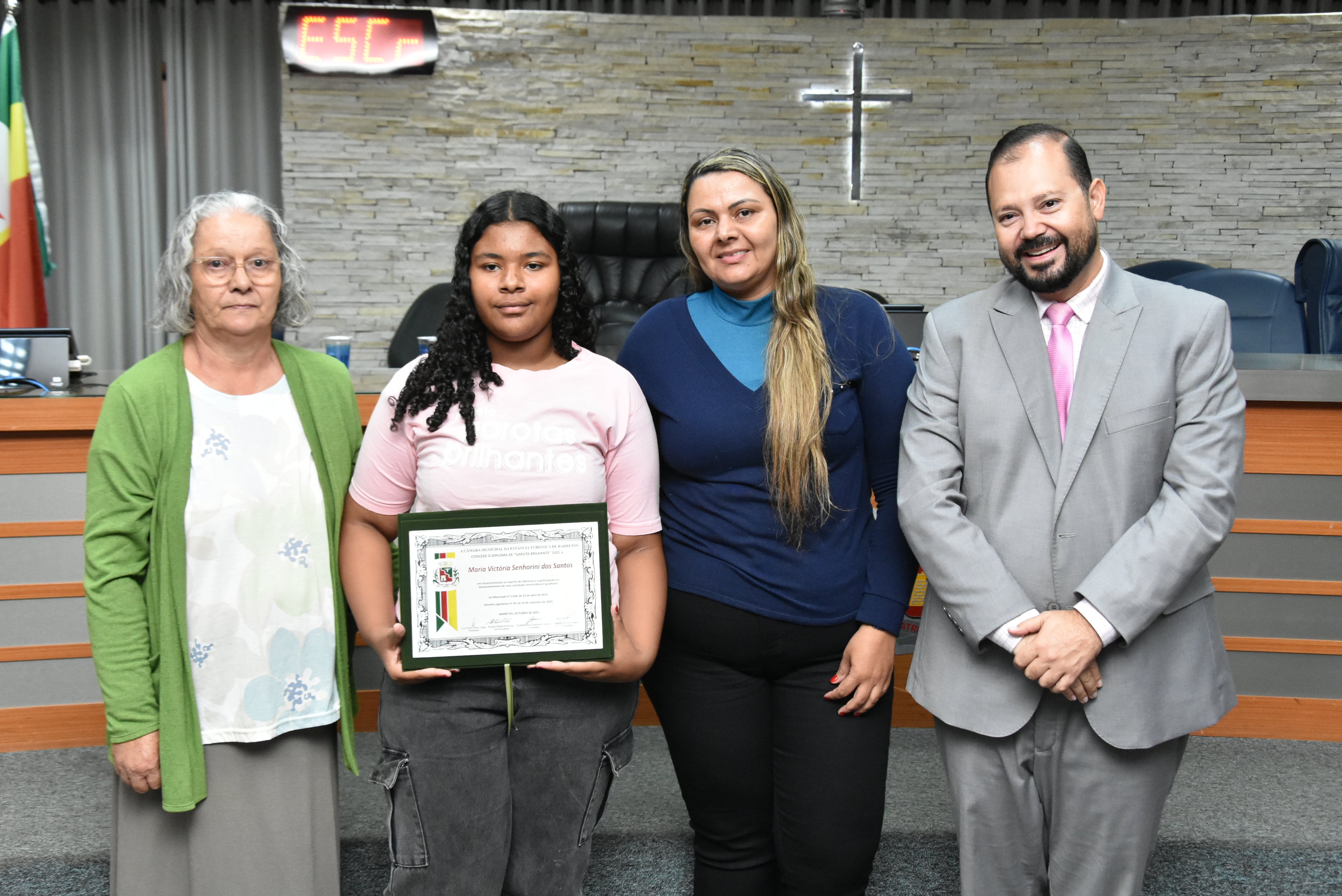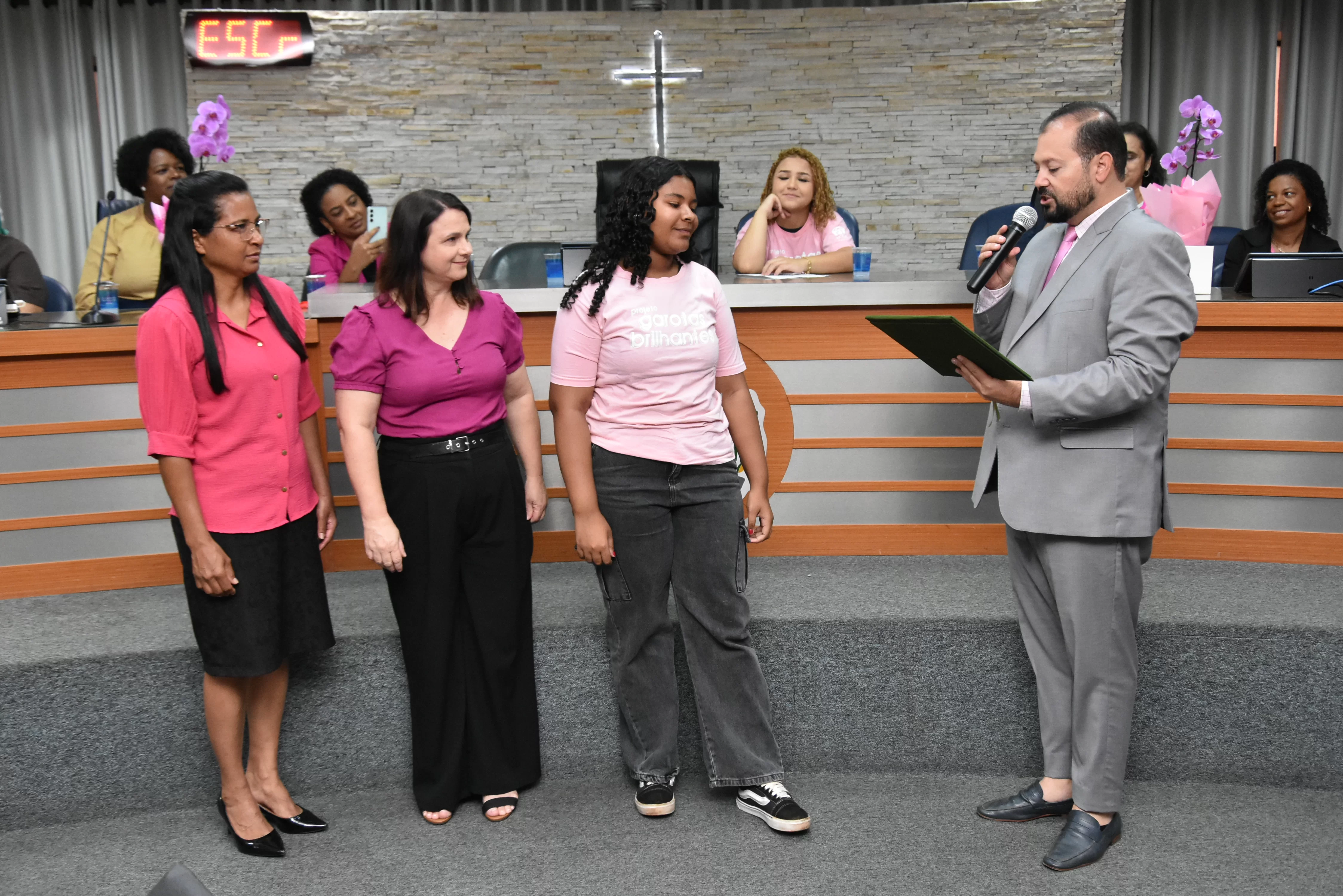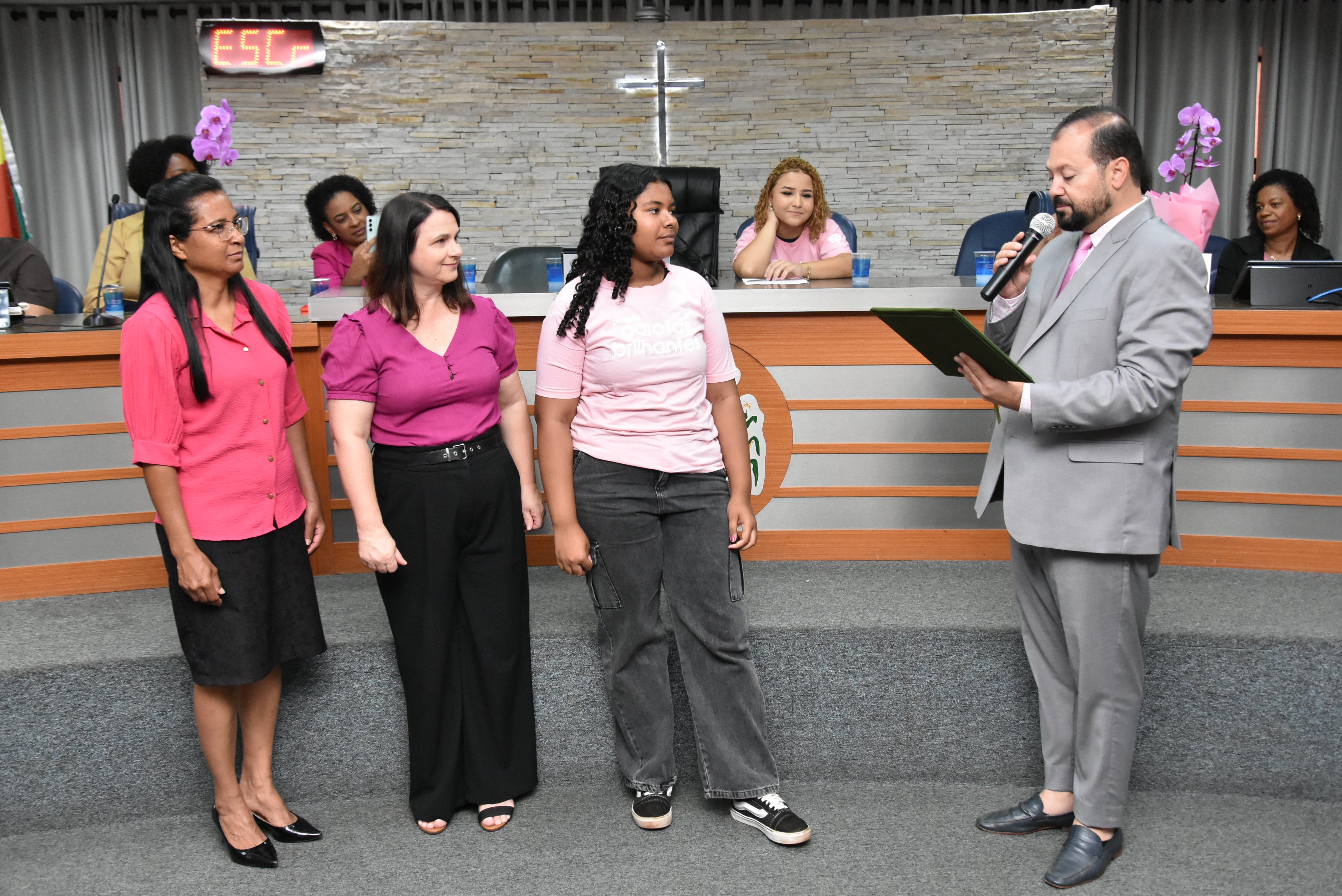 A solenidade foi conduzida pelo 2º Secretario da Câmara, Vereador Itamar Alves dos Santos (PSD) e contou ainda com presença do vereador Marcos Mariano (UNIÃO); da Coordenadora do CAAF -Centro Adventista de Apoio à Família de Barretos, Adriana Gonçalves Ferreira; da Assistente Social do Projeto Garotas Brilhantes, Pâmela Camargo; da Coordenadora Regional da ADRA - Agência Adventista de Desenvolvimento e Recursos Assistenciais, Estela Maris Miller Reis; da Diretora da Escola Estadual Mario Vieira Marcondes (local onde funciona o projeto Garotas Brilhantes); Marta Regina Rocha, Secretária Municipal de Assistência Social e Desenvolvimento Humano, Juliana Adão.