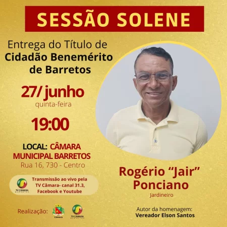 A Câmara de Barretos realiza no dia 27 de junho (quinta-feira), às 19h, Sessão Solene para entrega do Título de Cidadão Benemérito do Município da Estância Turística de Barretos ao jardineiro Rogério Ponciano, popularmente chamado de Jair.