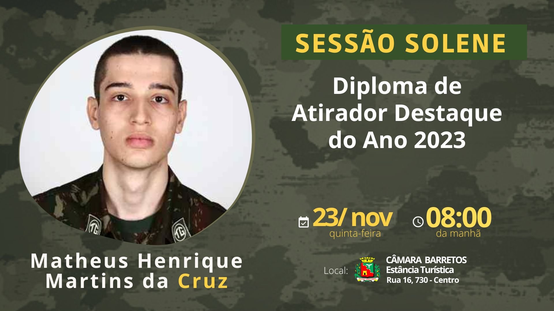 A Câmara de Barretos realiza no dia 23 de novembro (quinta-feira), às 08h (da manhã), Sessão Solene para entrega do Diploma "Atirador Destaque Ano" 2023, ao jovem Matheus Henrique Martins da Cruz "Atirador Cruz"