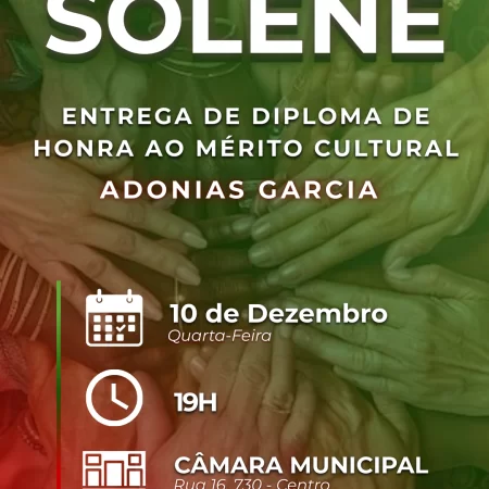 A Câmara Municipal de Barretos realizará na noite de quarta-feira (10/dezembro), às 19h, Sessão Solene de entrega do Diploma de Honra ao Mérito Cultural “ADONIAS GARCIA” 2025, que homenageará várias personalidades da cultura barretense.