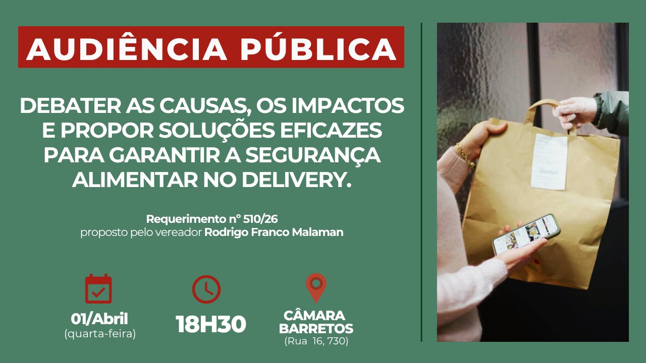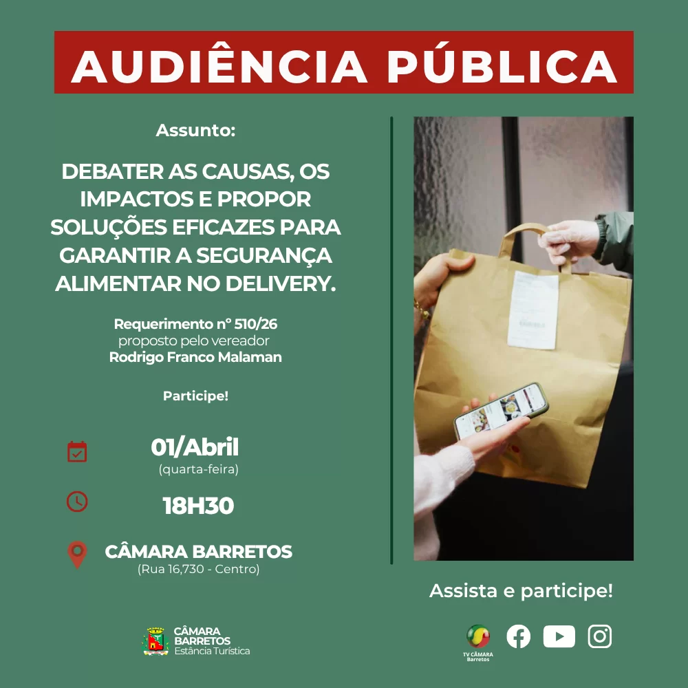 Com o crescimento expressivo dos pedidos por aplicativos e entregas domiciliares nos últimos anos, surgem também novos desafios relacionados ao armazenamento, transporte e higiene dos alimentos. A audiência pretende abrir espaço para ouvir a comunidade, identificar problemas recorrentes e propor soluções que garantam mais segurança e confiança para os consumidores.