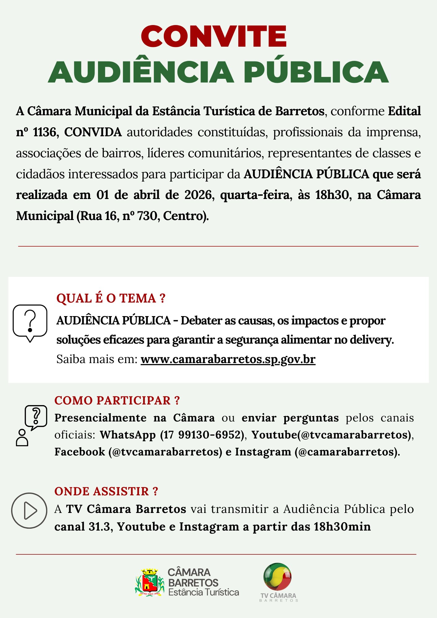 Acontecerá no próximo dia 1º de abril, quarta-feira, às 18H30, no Plenário da Câmara, Audiência Pública para discutir a segurança alimentar no delivery em Barretos.