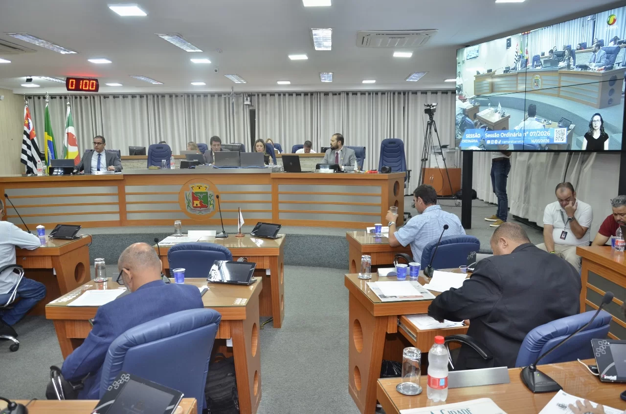 A Câmara de Barretos realizou na noite de segunda-feira (16/março), a 7ª Sessão Ordinária de 2026. Foram discutidas e votadas 16 matérias: 9 Projetos de Lei, 4 Projetos de Decreto Legislativo, 1 Projeto de Lei Complementar e 2 Pareceres de Inconstitucionalidade.
