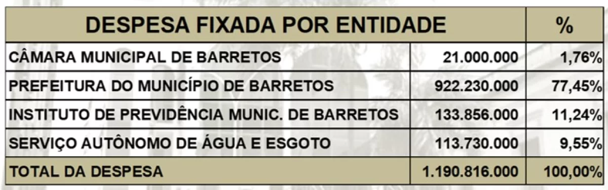 Na previsão de Despesas (gastos) do Município para 2025, os valores estão divididos em: R$ 922,2 milhões da Prefeitura (Educação, Saúde, Funcionalismo e outras Secretarias), R$ 133,8 milhões do IPMB (Instituto de Previdência do Município de Barretos), R$ 113,7 milhões do SAAEB (Serviço Autônomo de Água e Esgoto) e R$ 21 milhões para a Câmara Municipal.