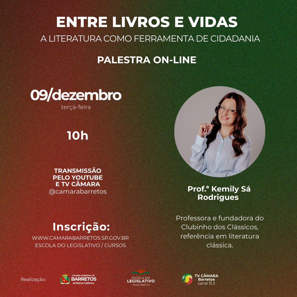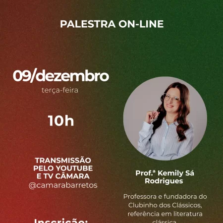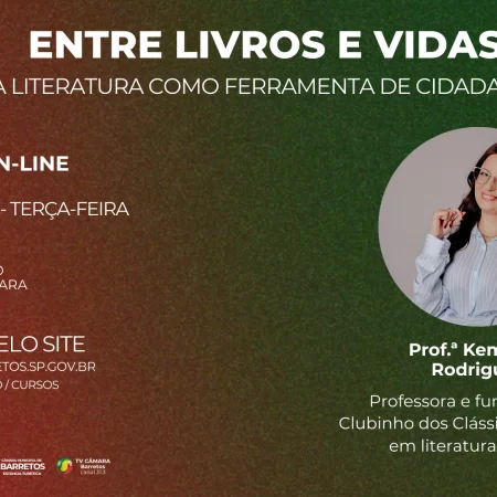 A Escola do Legislativo de Barretos realizará, na terça-feira, 09 de dezembro, às 10h, a palestra “Entre Livros e Vidas: A Literatura como Ferramenta de Cidadania”, ON LINE, com transmissão ao vivo pela TV Câmara (canal 31.3), YouTube e plataforma Zoom.