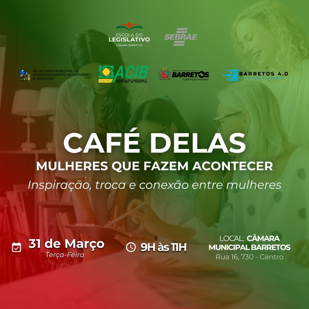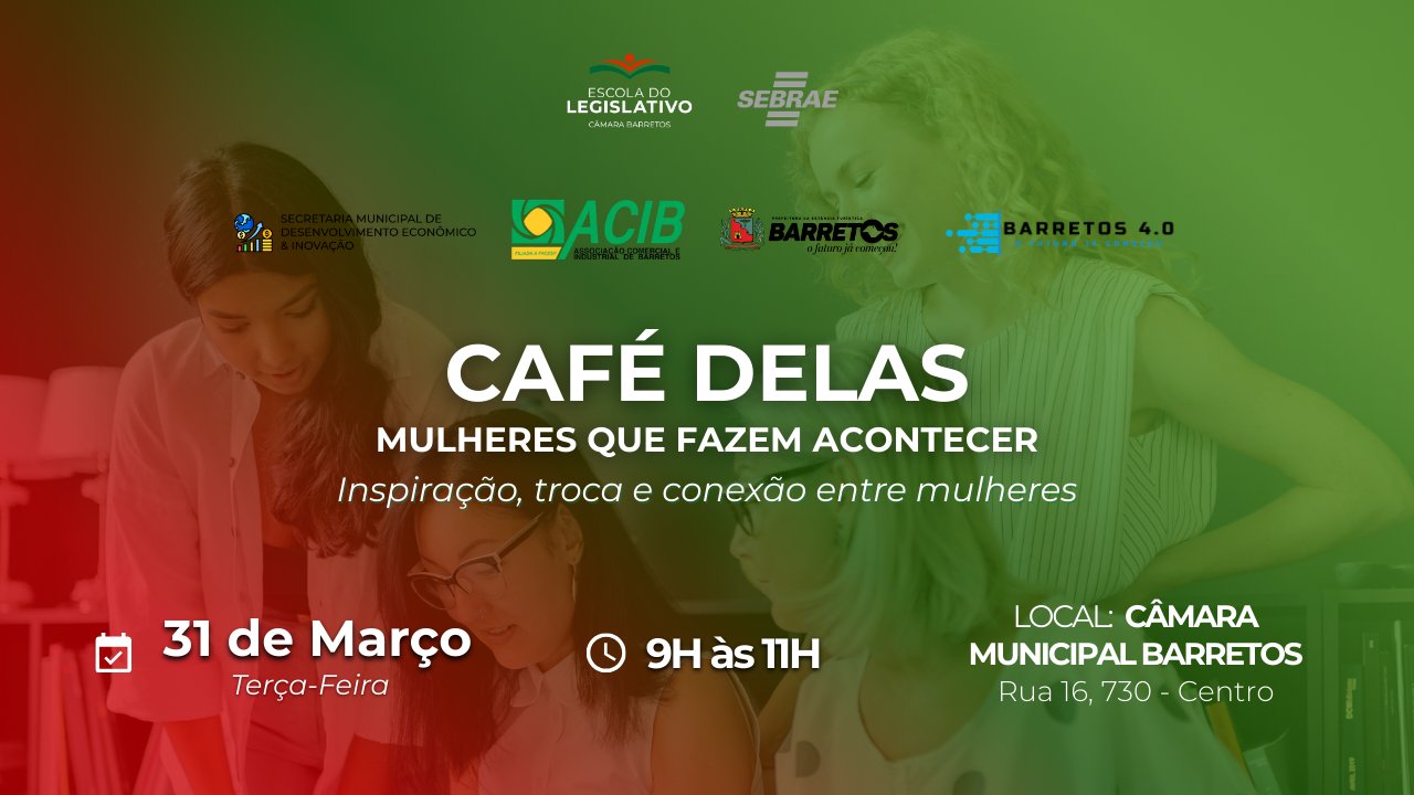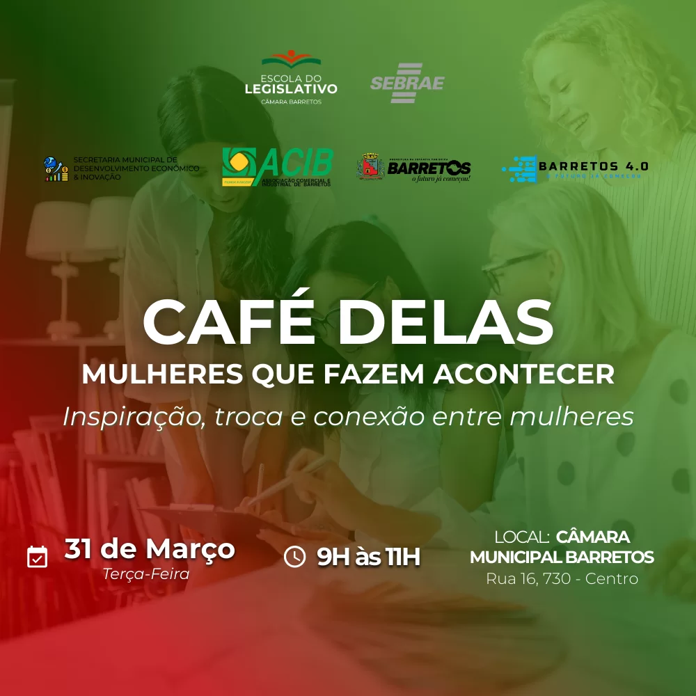 A Escola do Legislativo da Câmara de Barretos, em parceria com o SEBRAE, promoverá o evento “CAFÉ DELAS – Mulheres que Fazem Acontecer”, reunindo empreendedoras, lideranças e mulheres interessadas em fortalecer sua atuação no mercado e na sociedade.