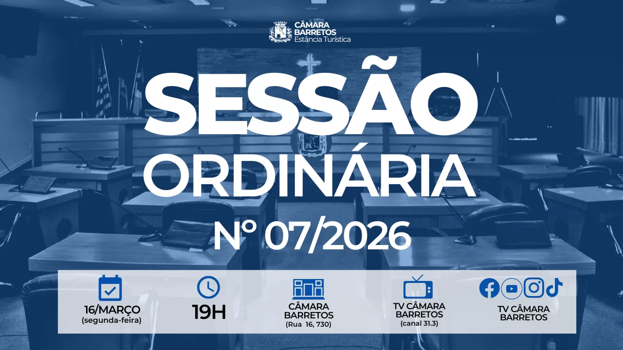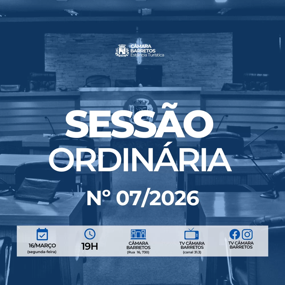 A Câmara de Barretos realiza na segunda-feira (16/março), às 19h, a 7ª Sessão Ordinária de 2026. Ao todo serão discutidas e votadas 08 matérias: 2 Projetos de Lei, 3 Projetos de Decreto Legislativo, 1 Projeto de Lei Complementar e 2 Pareceres de Inconstitucionalidade.